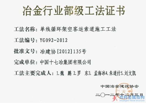 獲得2012年度冶金行業部級工法的有:冶金工程技術公司的《單線循環架空客運索道施工工法》和《插拔式高壓終端制作工法》、城建工程技術公司的《長螺旋鉆干法成孔抗浮錨樁施工工法》和《土釘墻基坑支護加筋水泥土錨樁施工工法》,風力與太陽能發電工程技術公司的《2MW海上風力發電機安裝工法》。