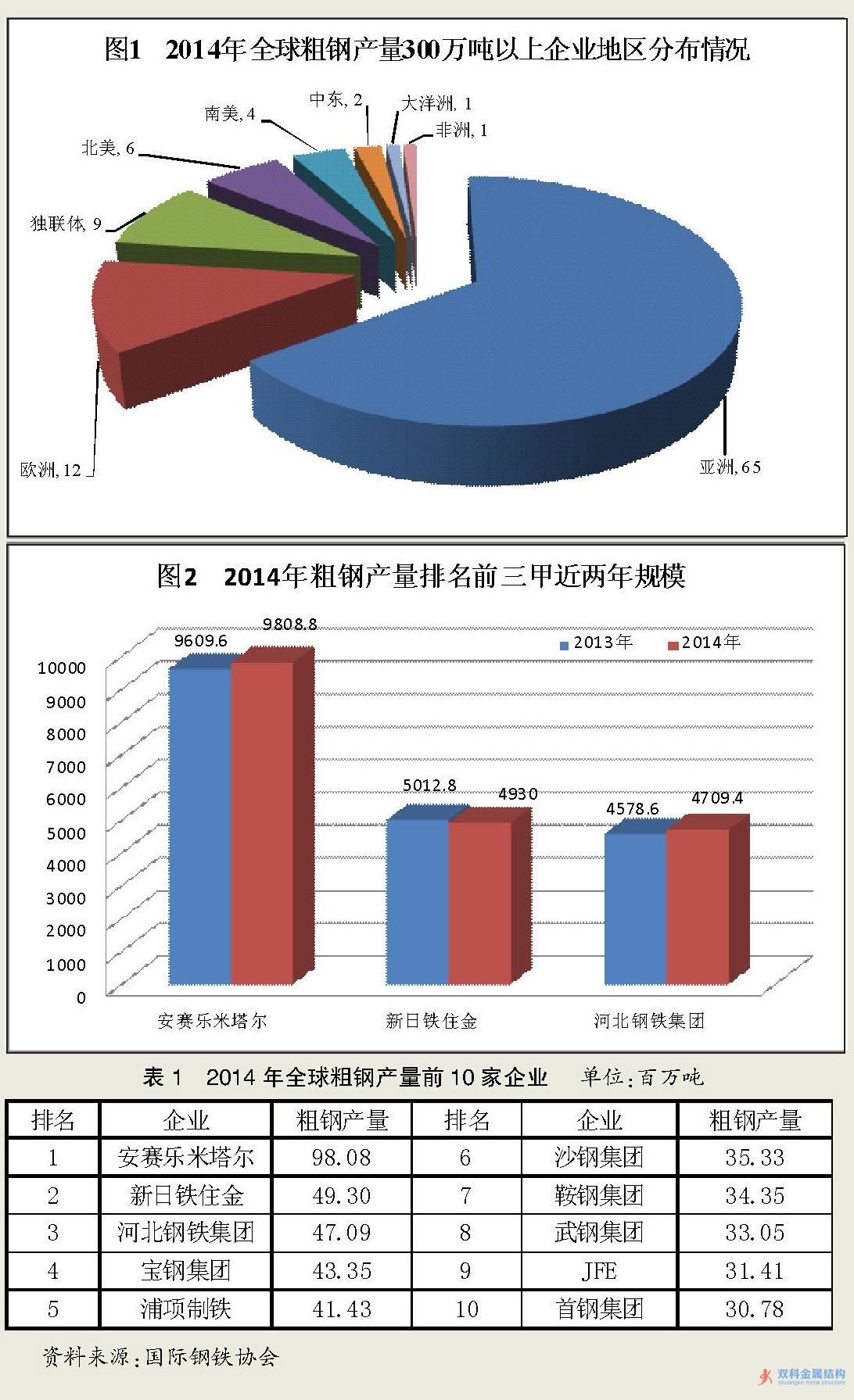 安賽樂米塔爾2014年粗鋼產量為9808.8萬噸,占入圍企業2014年合計粗鋼產量的8.15%,占世界粗鋼總量的5.89%;新日鐵住金2014年粗鋼產量為4930.0萬噸,占入圍企業2014年粗鋼產量的4.09%,占世界粗鋼總量的2.96%;河北鋼鐵集團2014年粗鋼產量為4709.4萬噸,占入圍企業2014年粗鋼產量的3.91%,占世界粗鋼總量的2.83%。